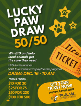 From November 15 to December 15, every ticket you buy is a chance to win big and make a life-changing difference for animals in our community. This month-long 50/50 raffle is your opportunity to help provide food, medical care, and safe shelter to the hundreds of cats, dogs, and small animals who depend on PAWR every year — and maybe walk away a little “richer” yourself!