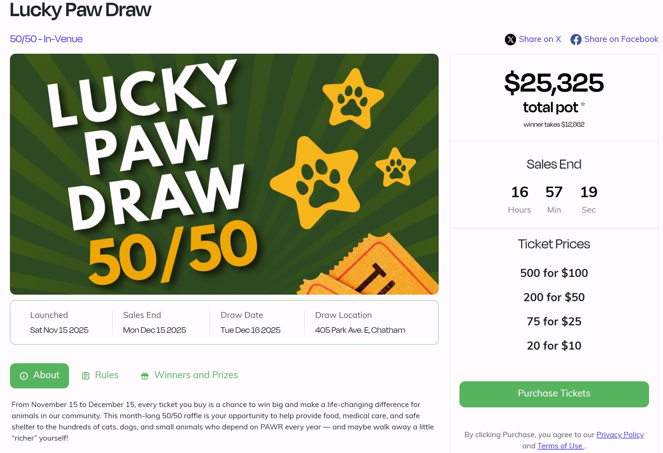 Even better, every ticket purchased stays right here in Chatham-Kent, helping provide urgent medical care, warm shelter, and loving second chances for the animals who depend on PAWR each day.