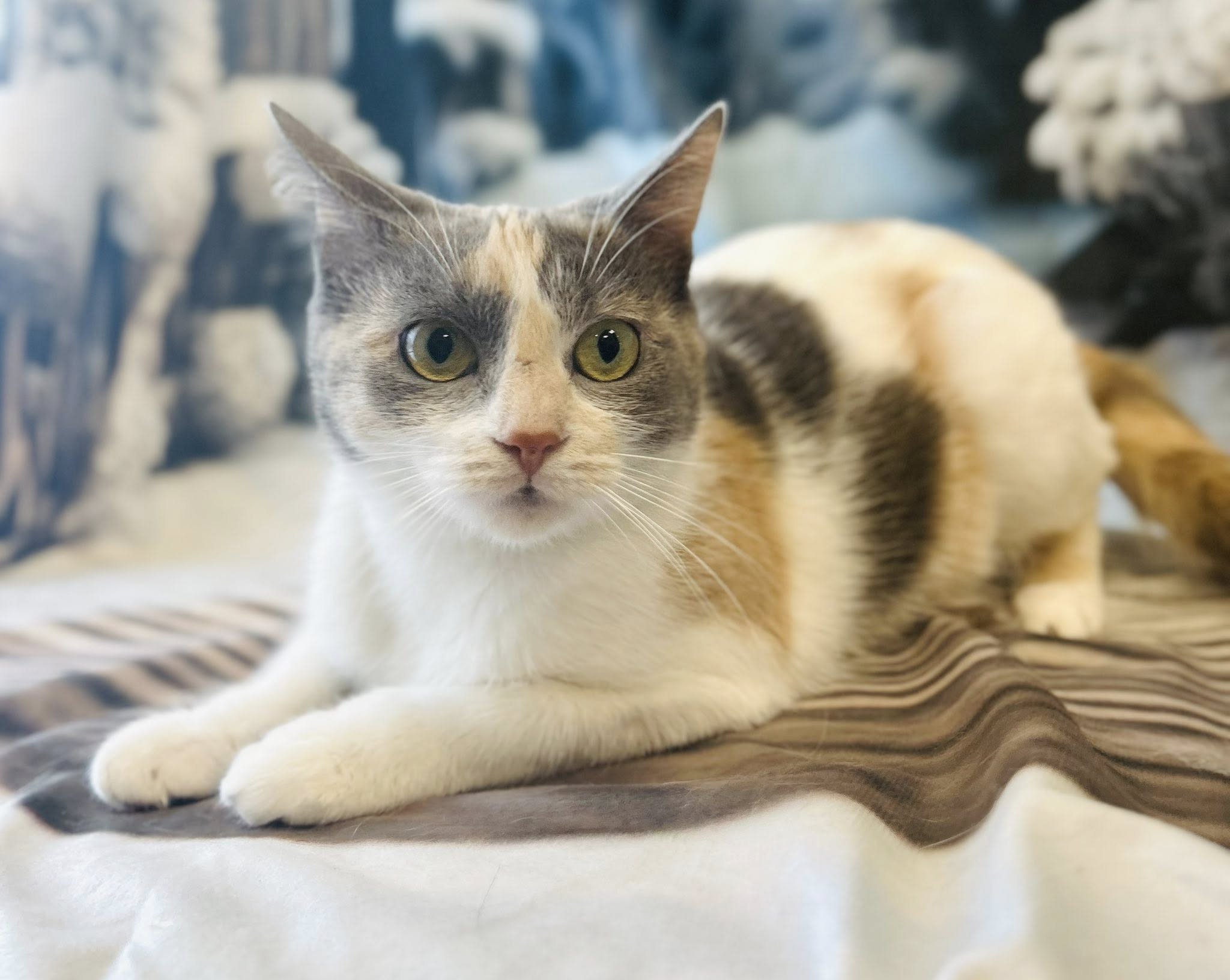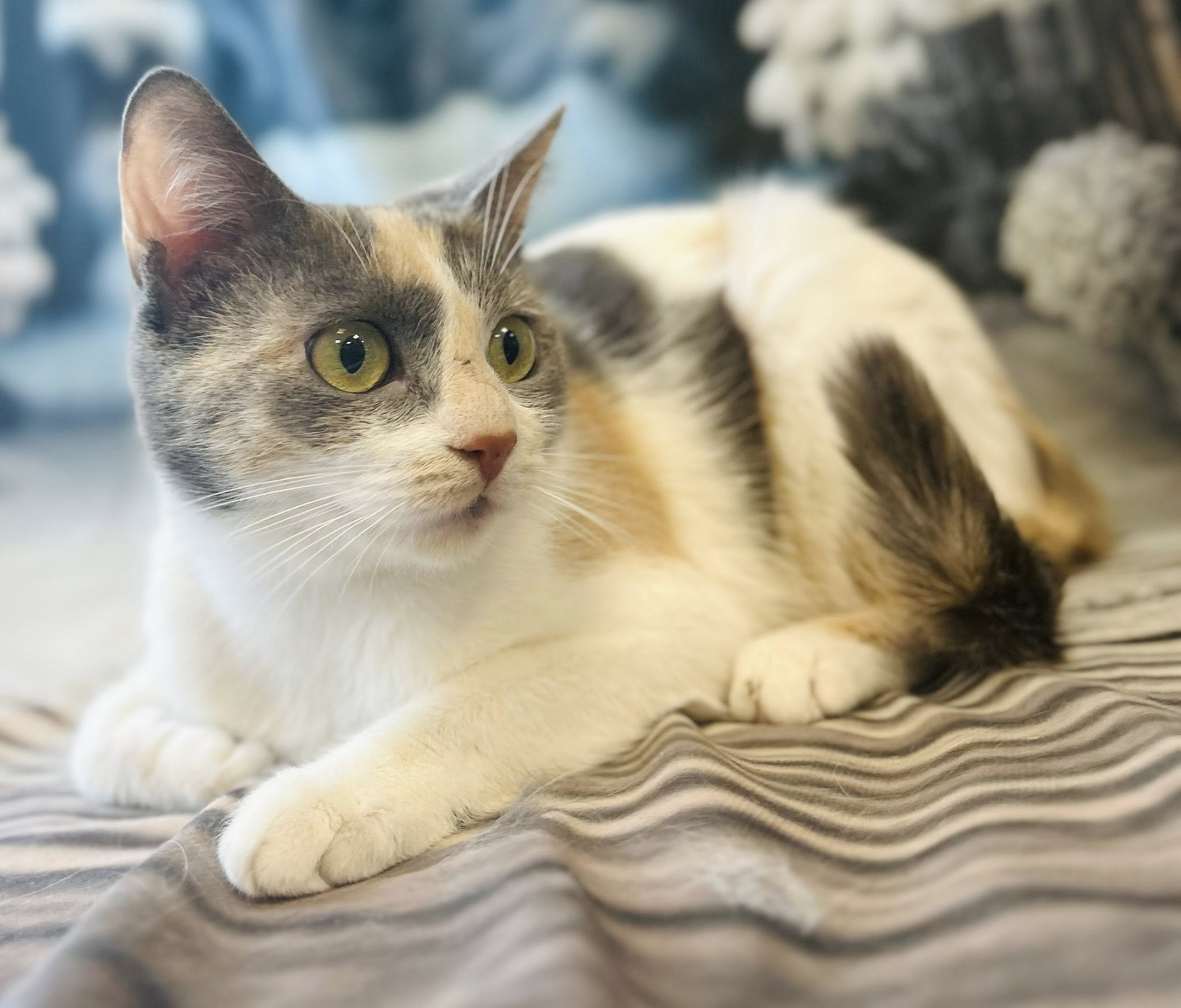 But don’t let the goofy name fool you — she’s also a total sweetheart. She loves gentle pets, cozy naps, and being near her favorite humans. Once she feels comfortable, she’ll happily curl up beside you and share her warm, affectionate side.