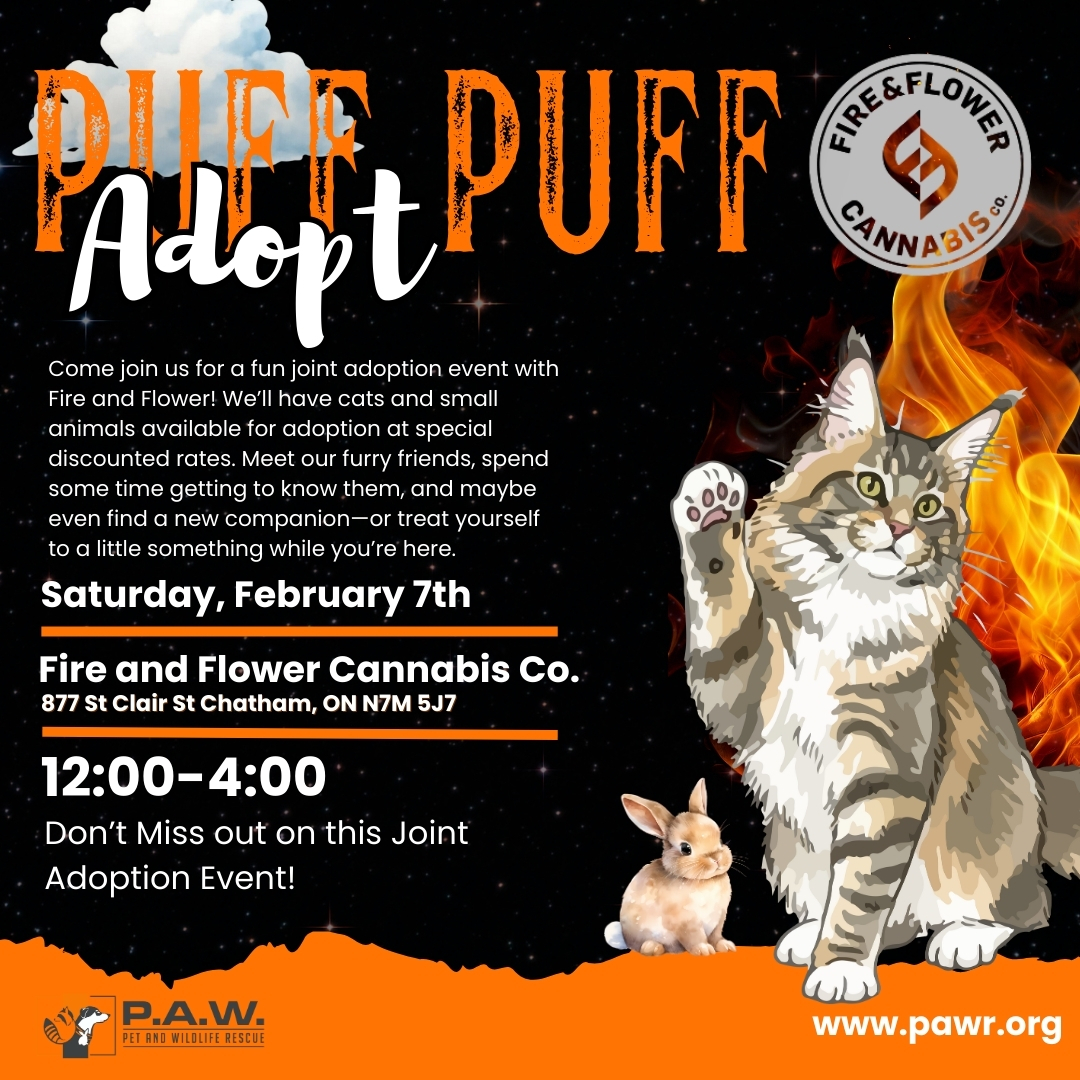 Come join us for a fun joint adoption event with Fire and Flower! We’ll have cats and small animals available for adoption at special discounted rates. Meet our furry friends, spend some time getting to know them, and maybe even find a new companion—or treat yourself to a little something while you’re here.